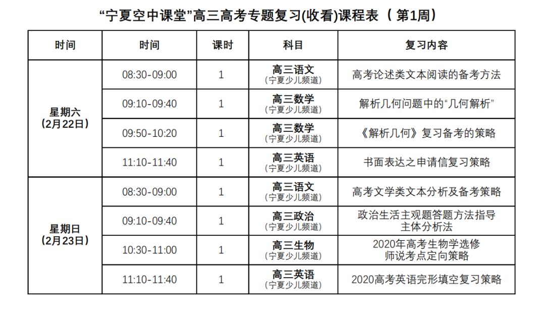 空中课堂的课程表将在宁夏教育厅网站及微信公众号、宁夏教育云平台、宁夏教育电视台微信公众号等媒体发布,请持续关注。